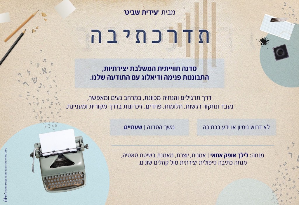 מוזמנים להצטרף לסדנת כתיבה יוצרת חווייתית המשלבת יצירתיות ודיאלוג עם התודעה שלנו. הסדנה בהנחייתה של לילך אופק אחאי – אמנית, יוצרת, מאמנת בשיטת סאטיה, מנחה כתיבה טיפולית יצירתית מול קהלים שונים.